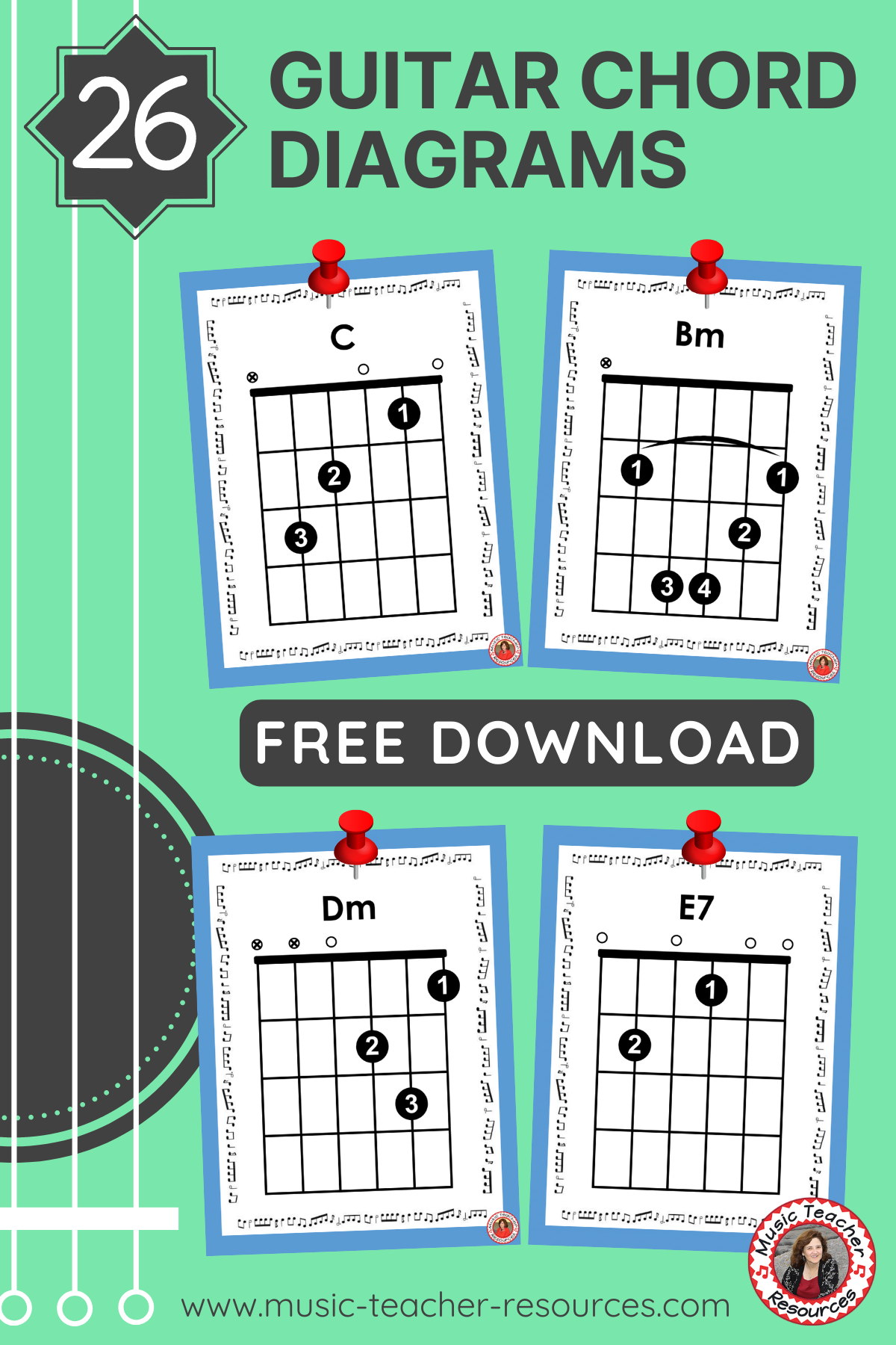 ♫ 26 full page diagrams of the most commonly learned and used guitar chords for young players
