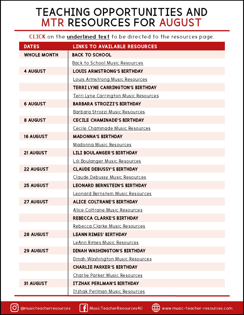 Enter your name and email address and click the button below to receive your FREE PDF file: AUGUST Teaching Opportunities and Resources.