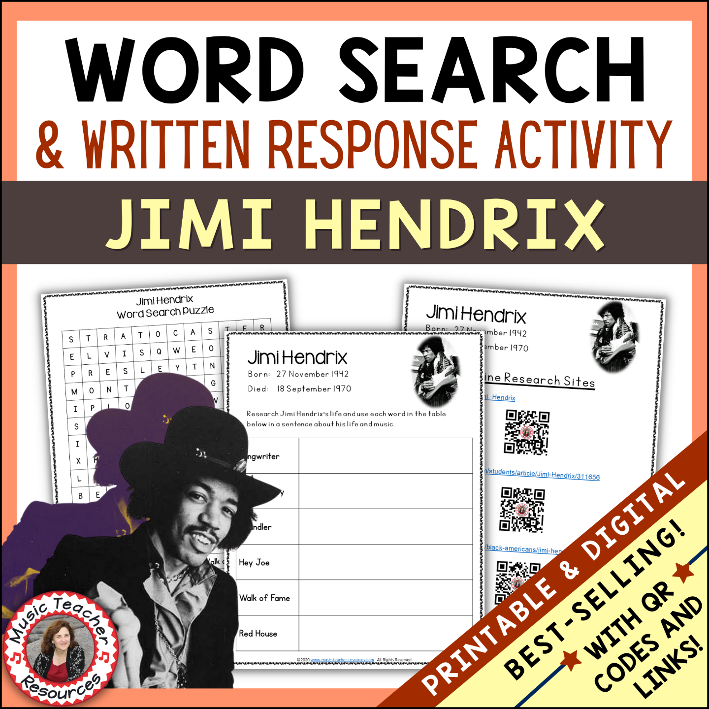 Jimi Hendrix Word Search and Research Activity