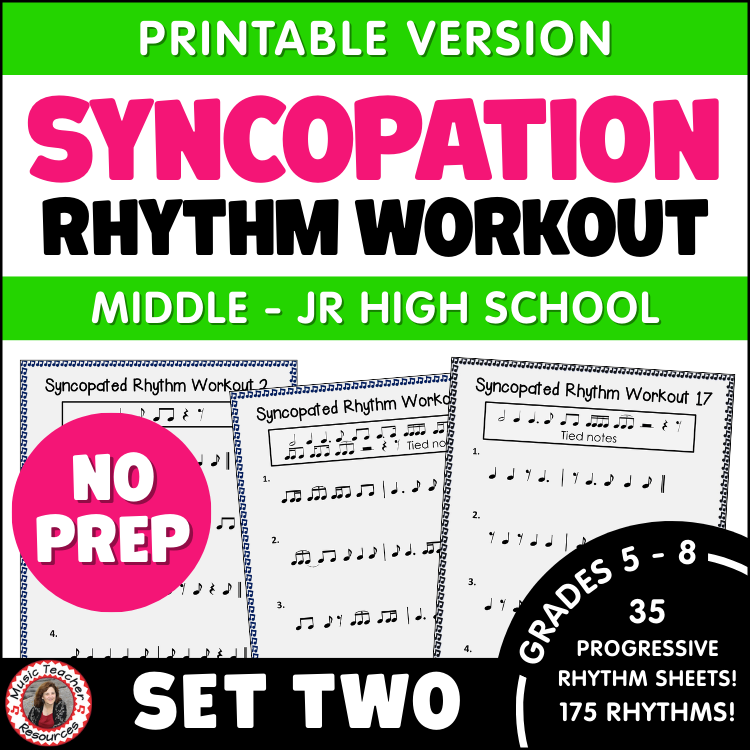 35 Rhythm Workout pages focused on syncopation with varying difficulty.