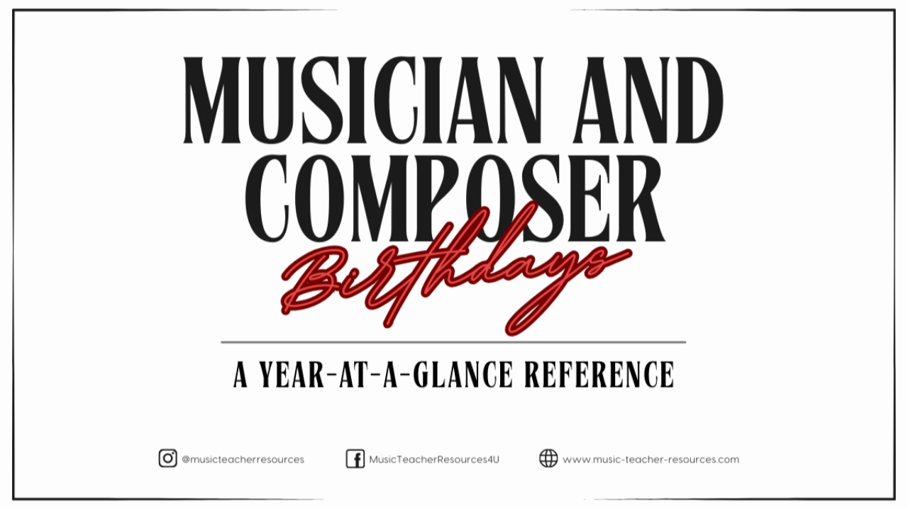 This Composer & Musician Birthdays Book puts a full year of school-appropriate composers, performers, and instrumentalists at your fingertips—so you can instantly spotlight a birthday for Composer or Musician of the Week or Month, spark discussion, support music journals, or anchor a short listening task.