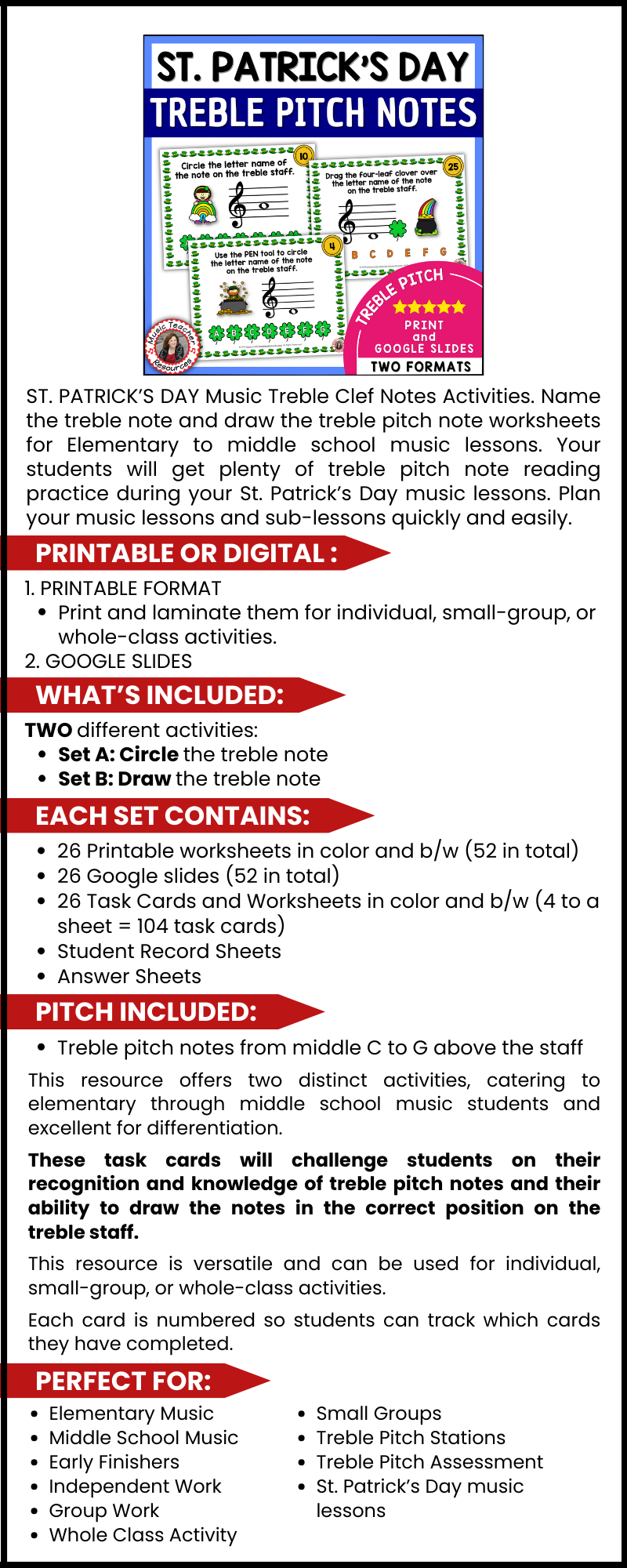 St. Patrick's Day Treble Clef Notes Worksheets and Task Cards